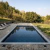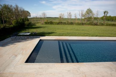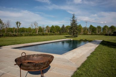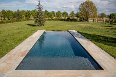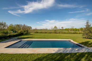 Una piscina interrata a sfioro infinito immersa nel verde adatta sia allo svago che al nuoto : la spiaggetta in ingresso crea un’ampia zona relax dove sedersi immersi in circa trenta centimetri d’acqua; la lunghezza della vasca permette però anche di nuotare agevolmente, grazie alla lunghezza totale di 14 metri che rende disponibile più di 10 metri di lunghezza oltre alla scala per lo sport ed il gioco. La scala interna, integrata con la spiaggia, permette un comodo accesso alla zona principale della piscina a doppia profondità.