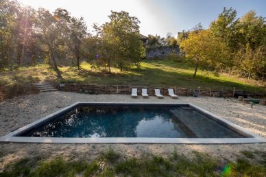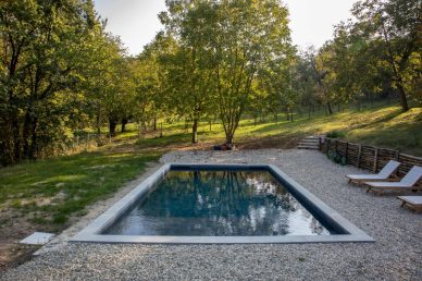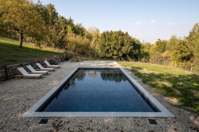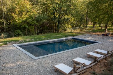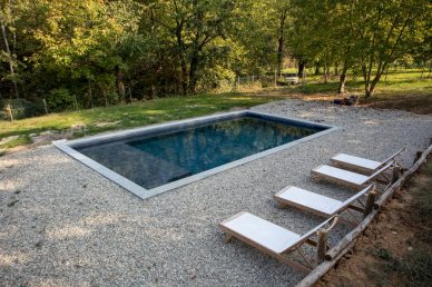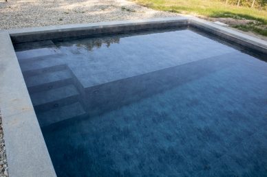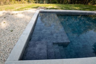Piscina interrata con spiaggia e rivestimento interno effetto pietra