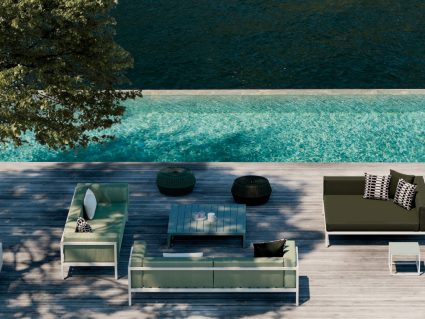 I cuscini Laminate, sfoderabili grazie alla cerniera realizzata appositamente per evitare infiltrazioni, sono tinti in massa: il colore viene aggiunto direttamente alla materia prima per rimanere invariato più a lungo.