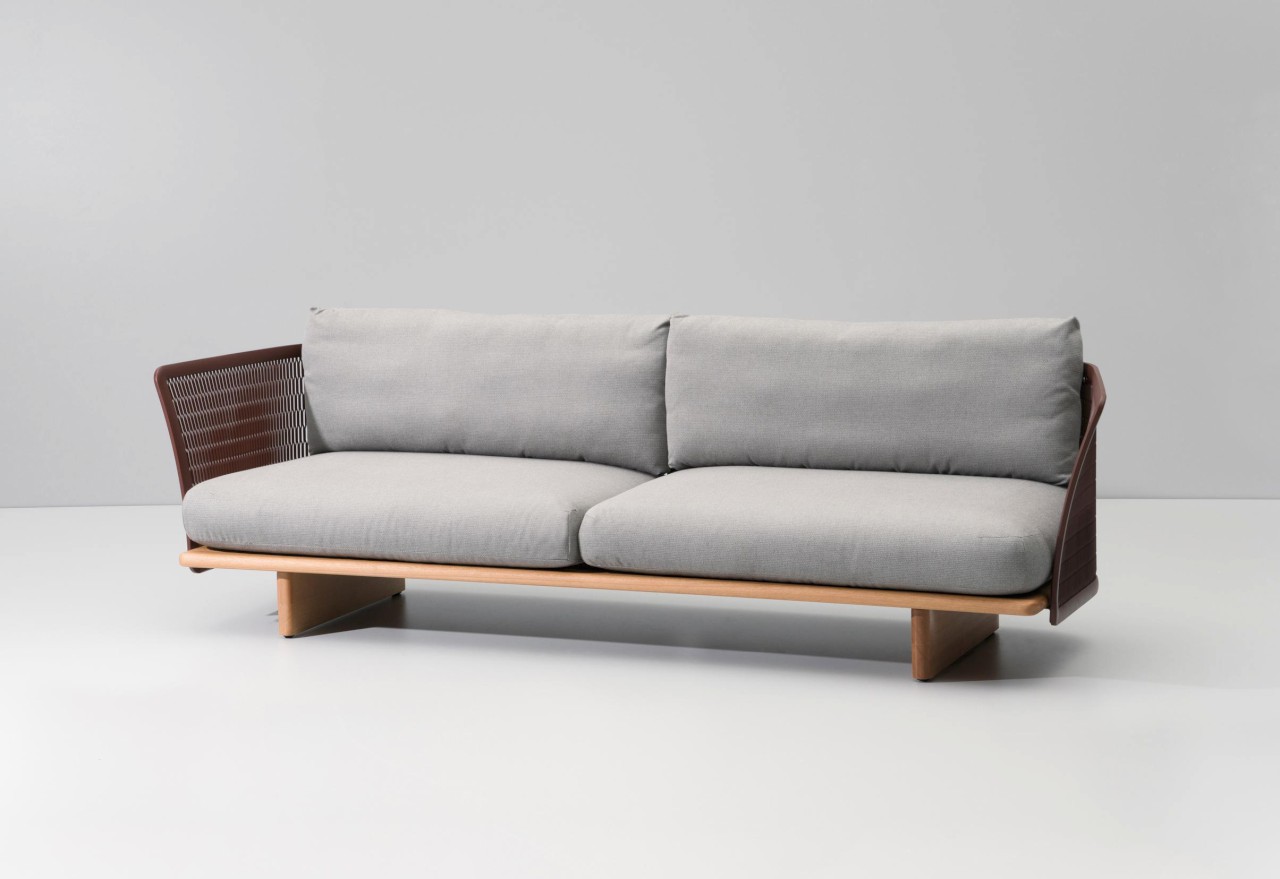 Il metallo espanso utilizzato per la struttura del divano tre posti Mesh di Kettal richiama le soluzioni architettoniche utilizzate negli edifici per lasciare entrare aria e luce, lasciando il resto all’esterno.