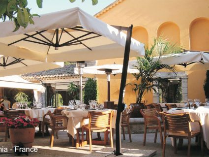 Possibilità di rotazione dell’ombrellone, anche aperto, e sistema di bloccaggio della rotazione. Lo snodo del palo orizzontale permette di inclinare la copertura lateralmente, adattando la zona d’ombra secondo le proprie esigenze.