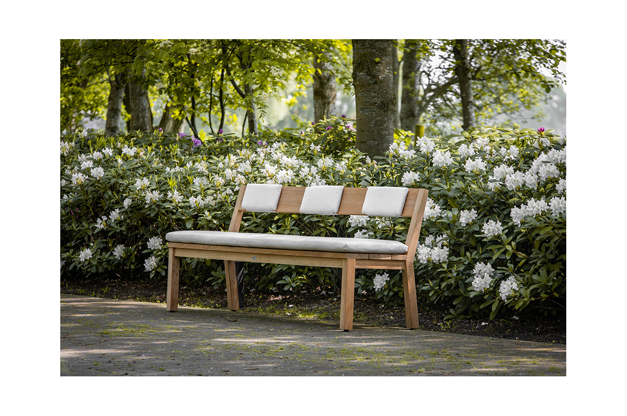Realizzata con il miglior teak proveniente da piantagioni sostenibili e certificate, la panca è disponibile in due misure e, grazie allo schienale leggermente reclinato, dà massimo confort di seduta.