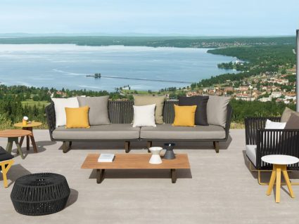 Il tavolo basso Bitta di Kettal presenta una struttura in alluminio verniciato a polveri di poliesteri, a cui può essere abbinato a scelta un piano nello stesso materiale, verniciato a polveri o con finitura Glaze, in legno teak, in travertino o in marmo.